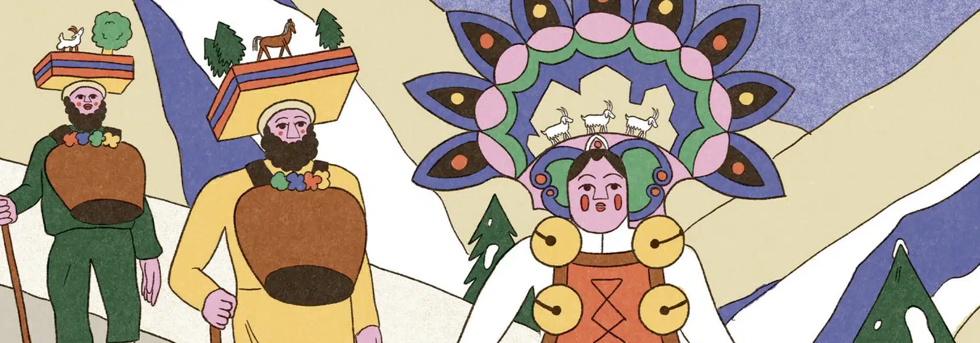 Avec des ciseaux et de la colle, construis ton «Klaus» du Silvesterchlausen ! Cette tradition appenzelloise marque le Nouvel An avec des costumes spectaculaires ornés de cloches. Découpe le corps et le masque, plie sur les pointillés, puis assemble les languettes dans l’ordre. Ton Klaus prendra vie pour décorer ta chambre !